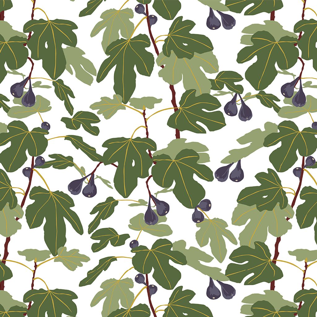 Fikonträd grön är ett mönstrat tyg inspirerat av frodiga fikonträd, där stora löv och mörka fikon skapar ett harmoniskt men samtidigt livfullt uttryck. Färgskalan går i flera nyanser av grönt med inslag av dovt lila och varma stjälkar, vilket ger mönstret både djup och variation.