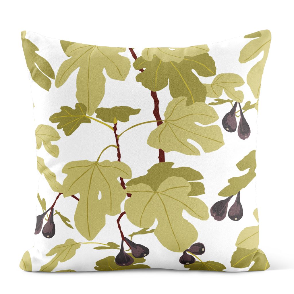 Ett kuddfodral med ett harmoniskt fikonmotiv i ljusgröna nyanser som ger en lugn och naturlig känsla till rummet.