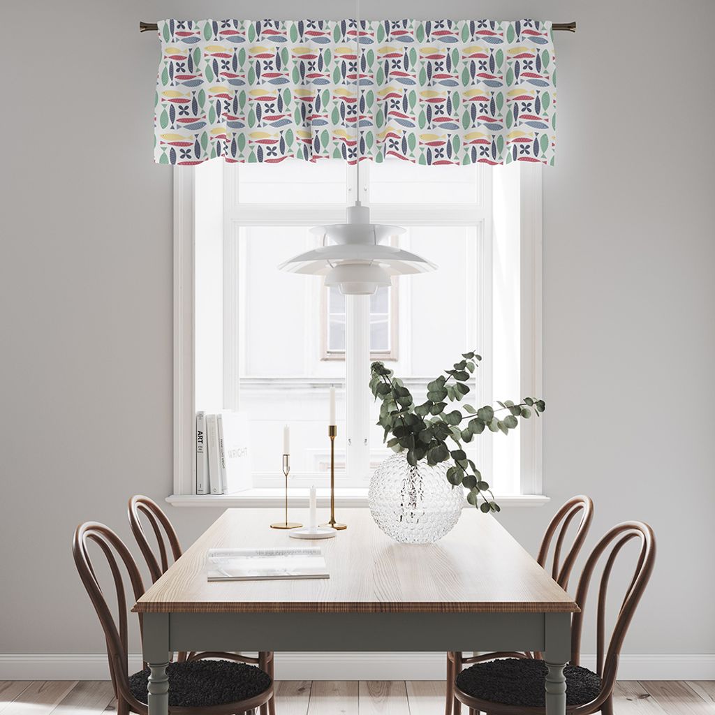Skapa en härlig och livfull atmosfär i ditt hem med Fina Fisken Gardinkappa . Det grafiska mönstret med stiliserade fiskar i rött, blått och grönt ger en retroinspirerad touch och en lekfull charm som passar perfekt i kök, matsalar eller sommarstugor.