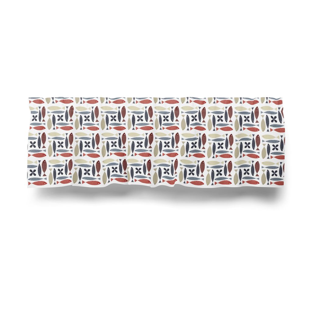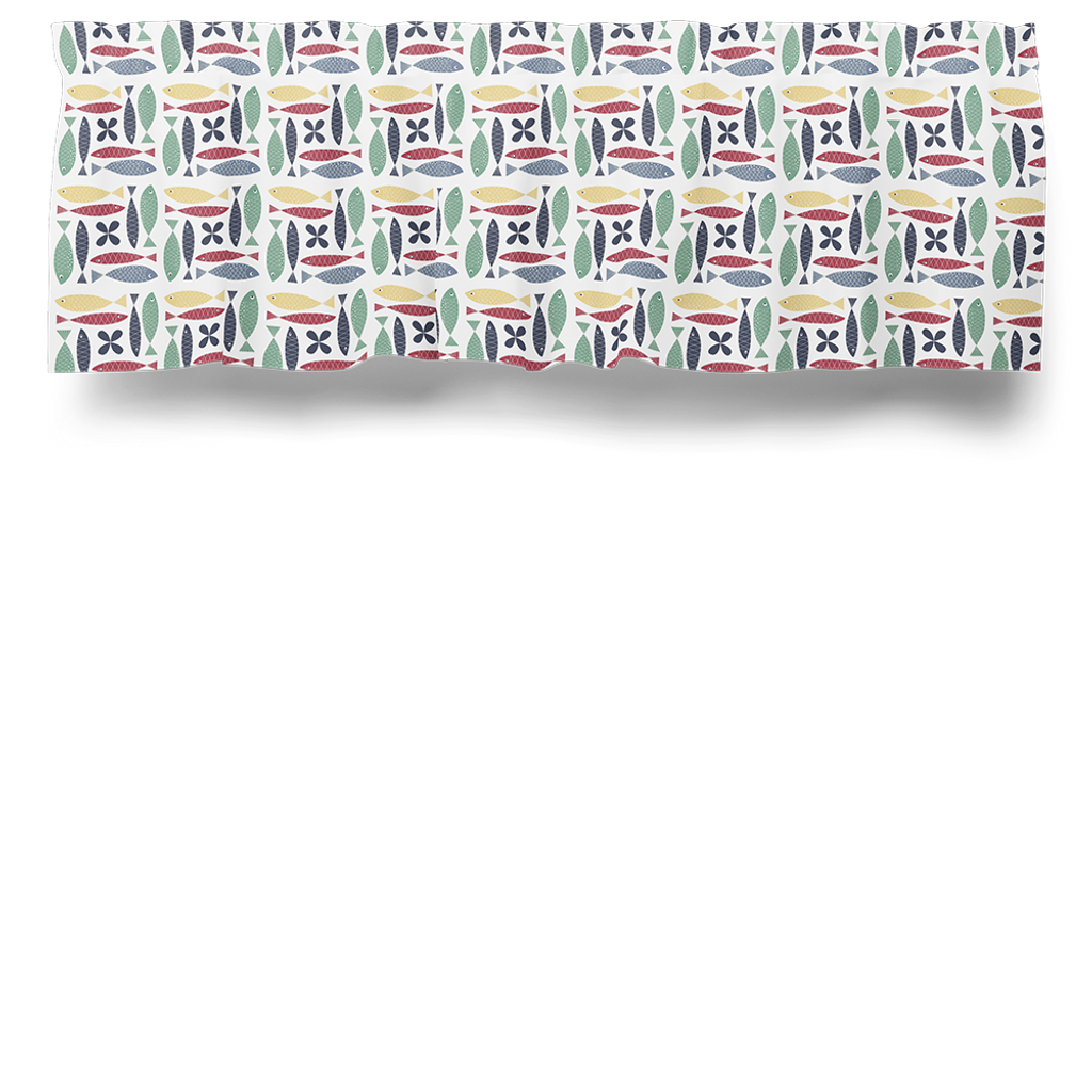 Gardinkappa på metervara med multiband, ofållade sidor. Med ett fiskmönster i rött, blått och grönt som ger en lekfull och stilren känsla. Kappan är 55cm hög.