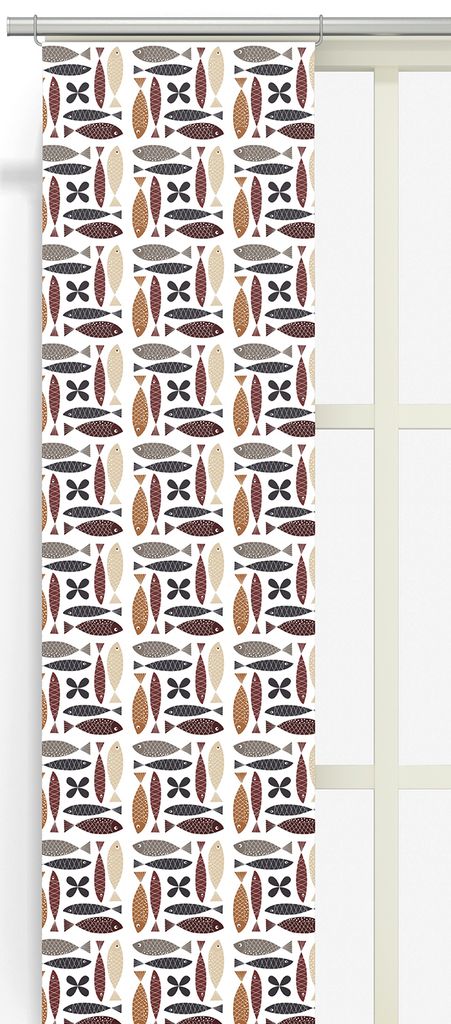 Fina fisken rost panelgardiner är ett mönstrat val för dig som vill skapa en personlig och inbjudande känsla i hemmet. Mönstret består av fiskar i olika former och färger, arrangerade i ett tätt men balanserat uttryck som ger liv utan att kännas rörigt. Färgskalan går i rost, beige, grått och mörka accenter mot en ljus botten, vilket gör panelgardinerna enkla att kombinera med både ljusa och mörka inredningsdetaljer.