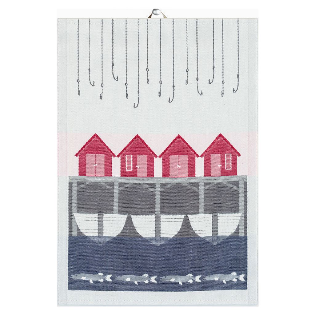 Handduk med motiv av röda stugor och fiskebåtar i skandinavisk design, tillverkad i Sverige från GOTS-certifierat ekologiskt material.