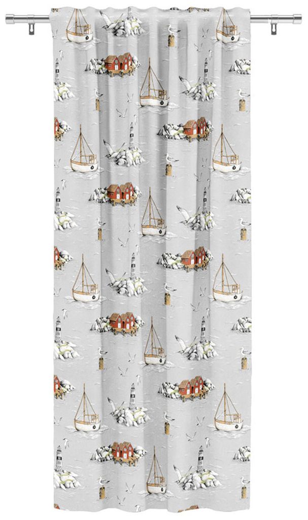 Grå botten med mönster likt fiskebåtar, fyrar och fiskmåsar.