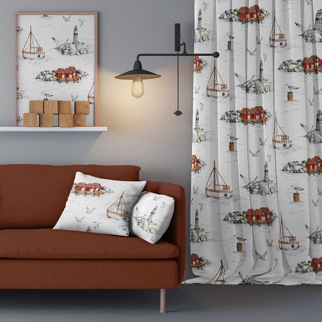 Gardiner med offwhite botten och mönster med fiskebåtar, fyrar och fiskmåsar. Ouppfållad med overlock nedtill