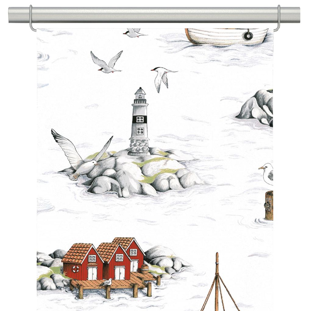 2-pack panelgardiner Fiskeskär vit med båtar, fyrar, båthus och fiskmåsar.