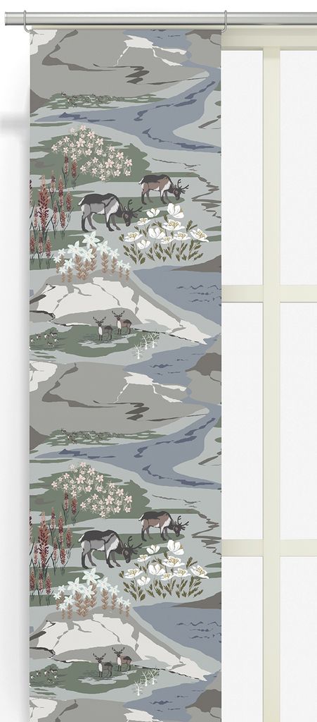 2-pack paneler med motiv från fjället med dess blommor och renar. Bilden visar endast exempel på hur gardinen kan se ut. Det kan skilja sig beroende på hur tyget är tillklippt.Panelerna är vita på baksidan.