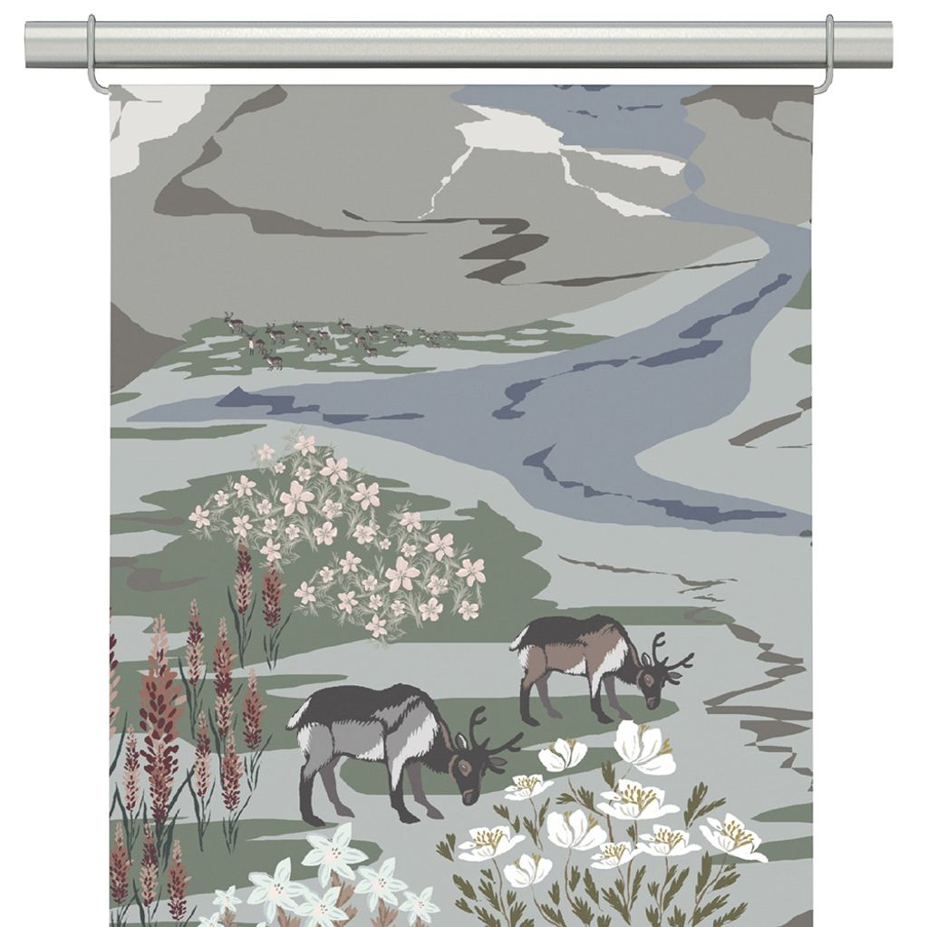 Panelgardiner med renar, fjäll och vackra blommor.