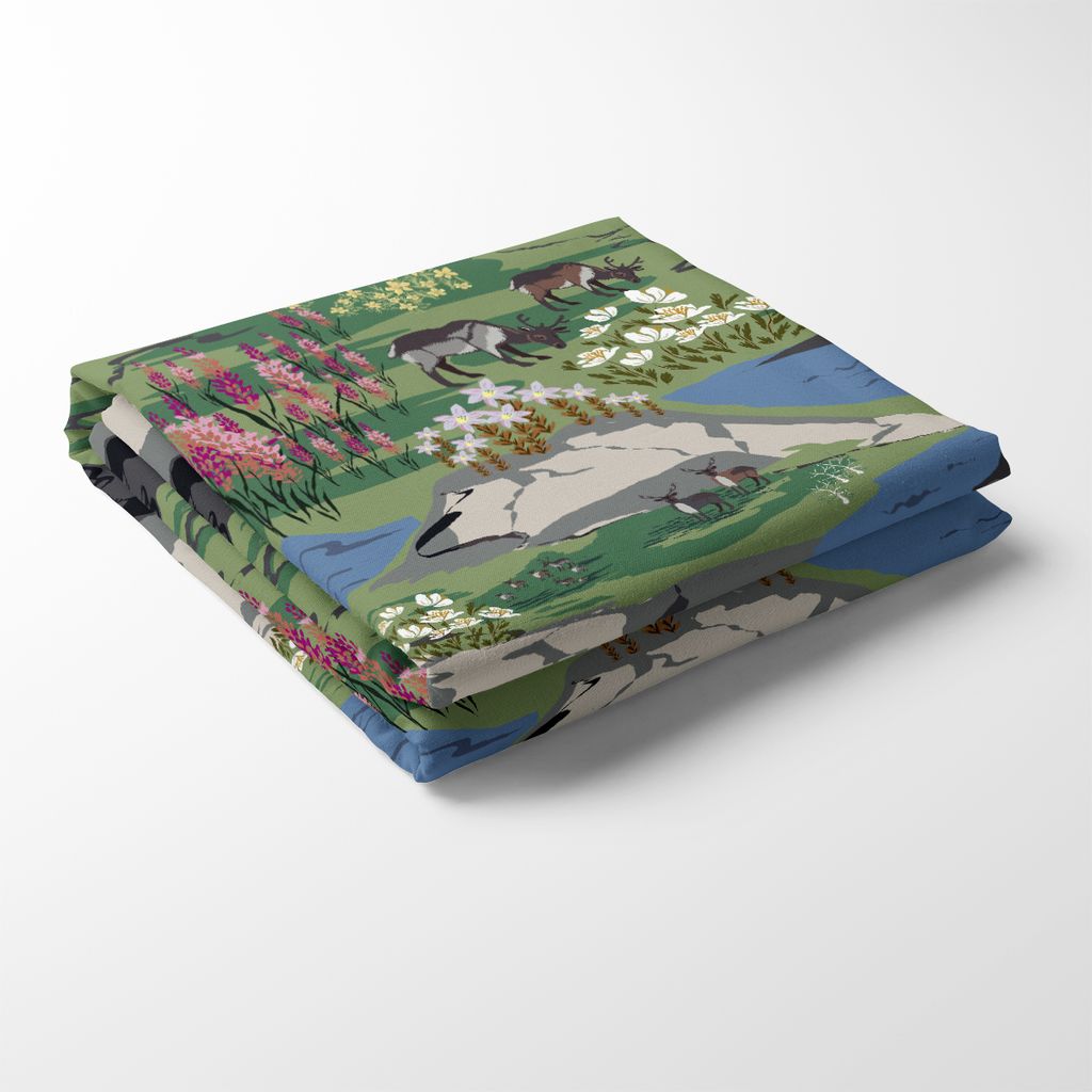 Bordsduk i tyget Fjällängar grå-grön, en upplevelse vid fjällvandring motiv från fjället med dess blommor och renar i varma färger.