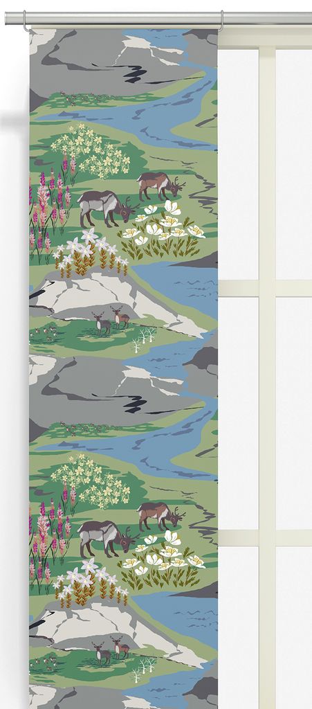 Panelgardiner med renar, fjäll och vackra blommor i härliga färger.