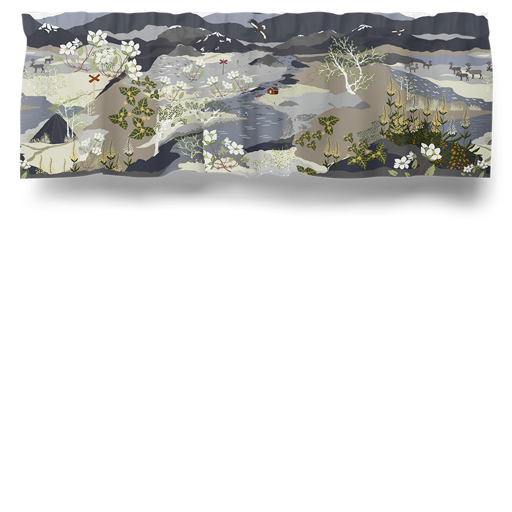 Gardinkappa med natur likt fjällen med berg, dalar renar i färgerna grått och blått