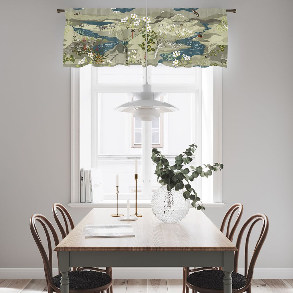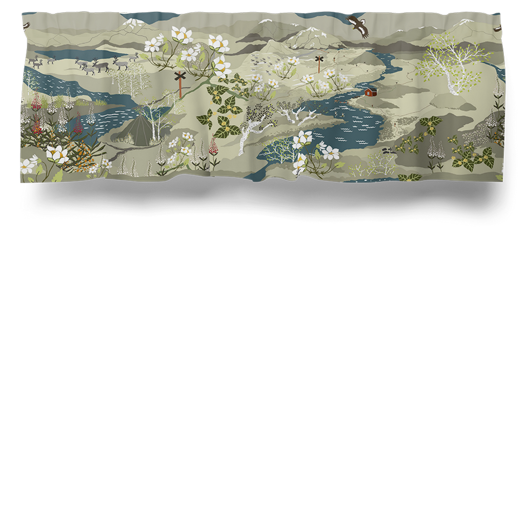 Låt naturen flytta in med Fjällvandring beige-blå Gardinkappa . Mönstret är inspirerat av den svenska fjällvärlden med blommor, fjälltoppar, rinnande vatten och vilda djur. De naturnära tonerna i grönt, blått och sand ger en lugn och harmonisk känsla.