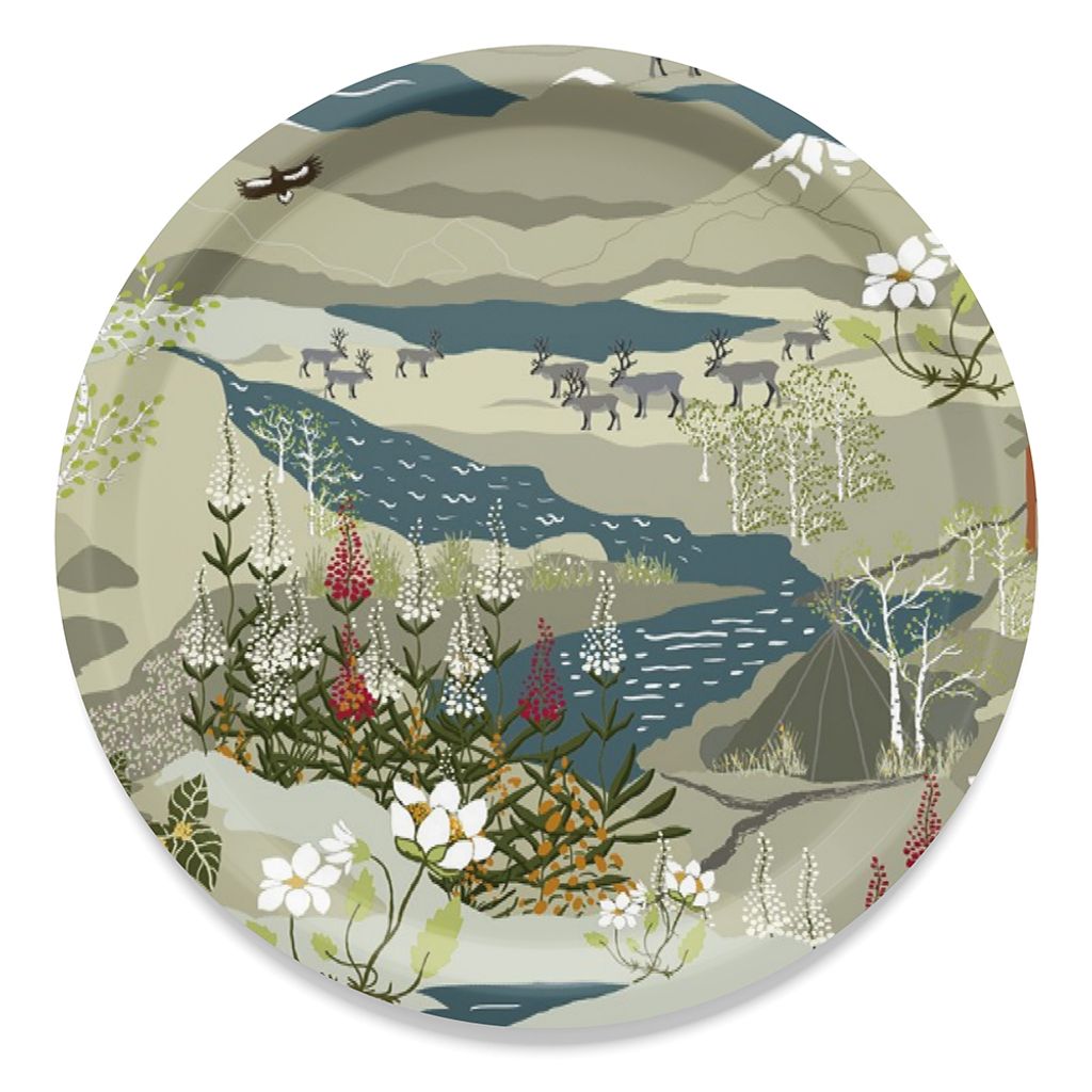 Beskrivning av Fjällvandring beige-blå rund bricka