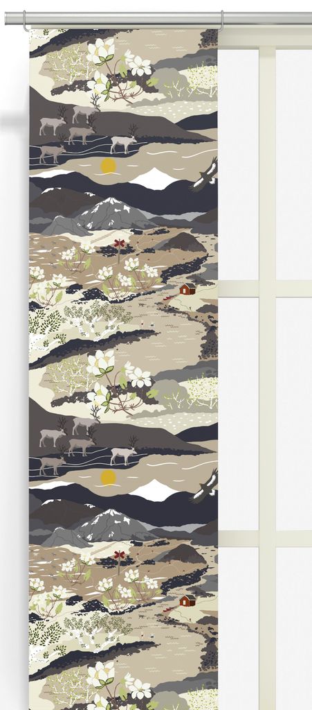 Beskrivning av Fjällvandring beige panelgardiner med fjällmotiv