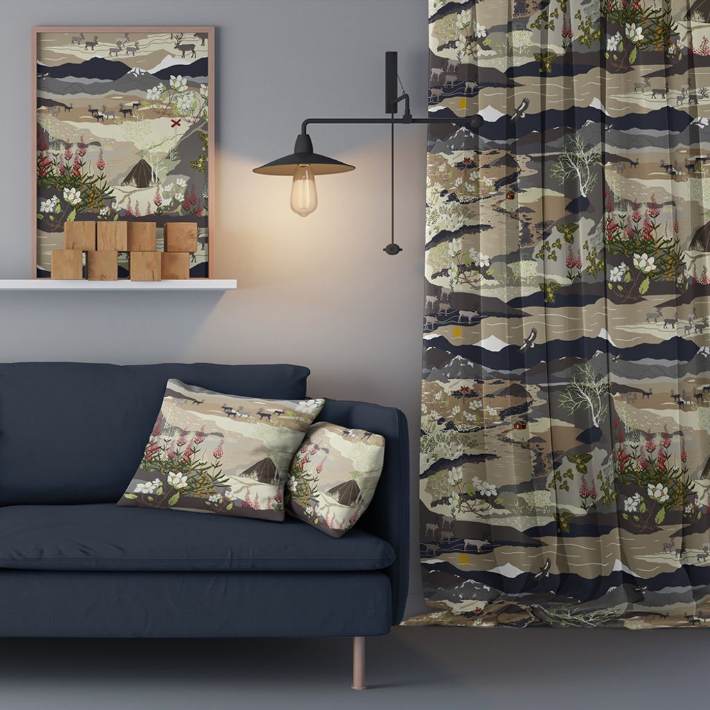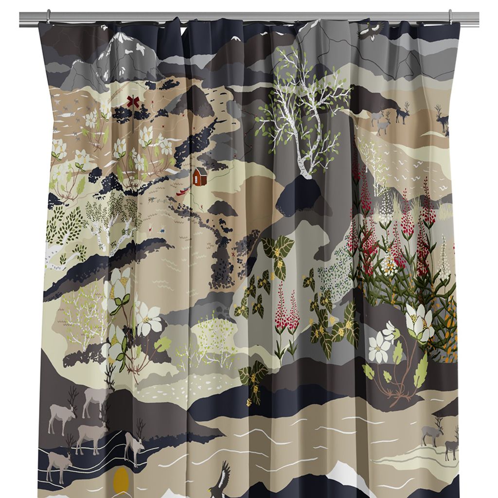 Grå, beige och brun gardiner med renar, fjäll och dalar likt en härlig fjällnatur.