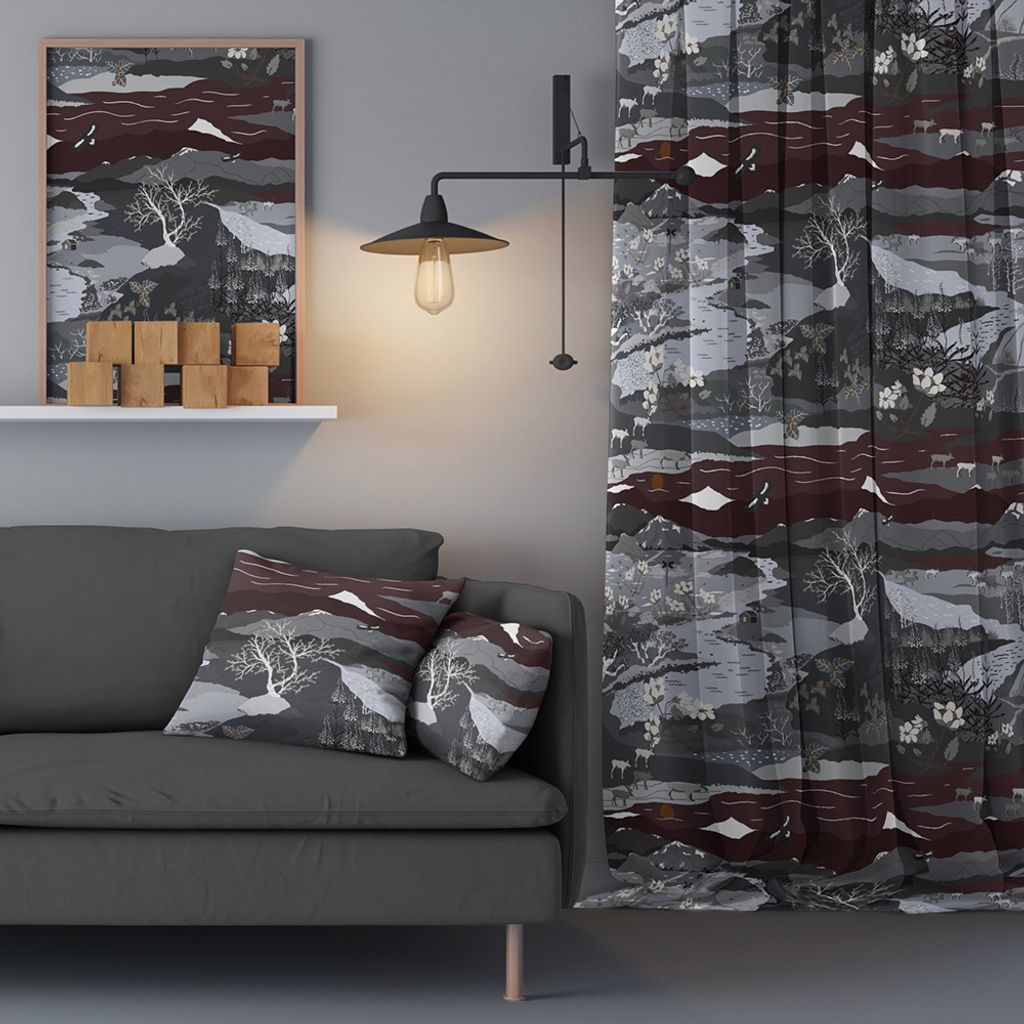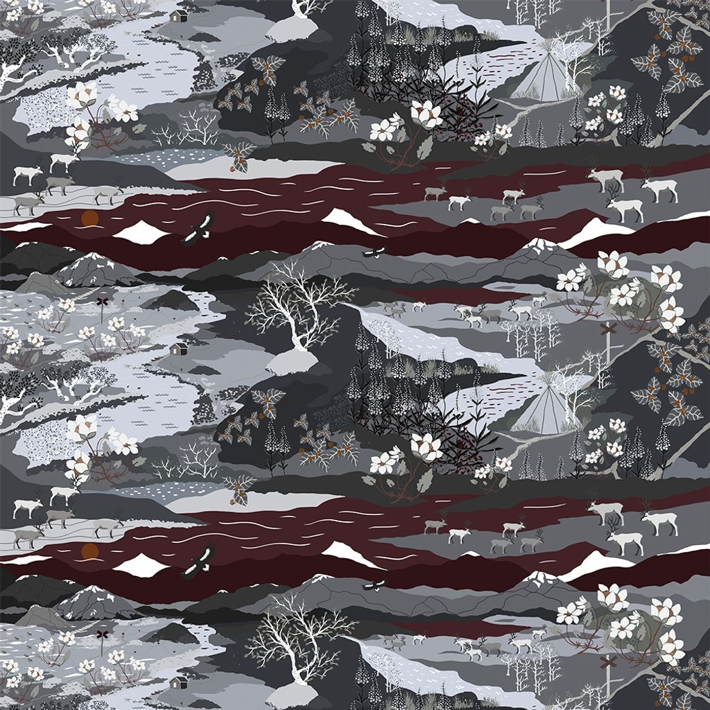 Ett mönster likt en naturupplevelse på fjällen med renar, berg och vatten. Mönstret är tryckt på Arvidssons klassiska bomullsvara.