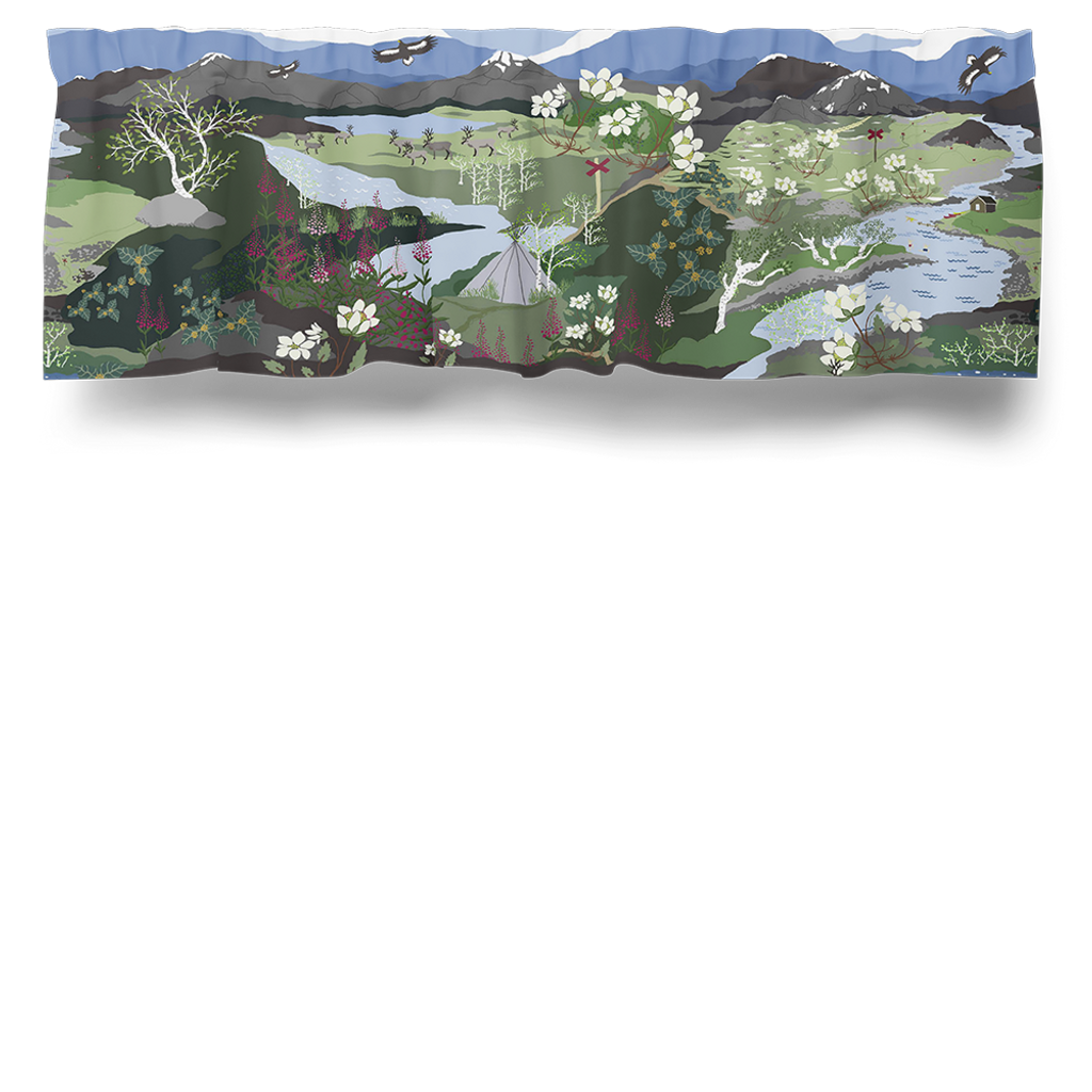 Gardinkappa med natur likt fjällen med berg, dalar renar i färgerna grönt och blått