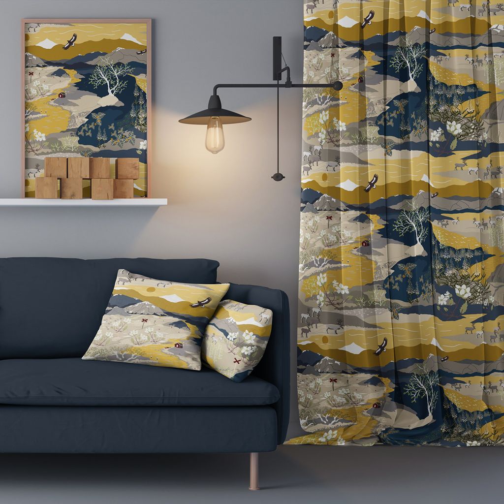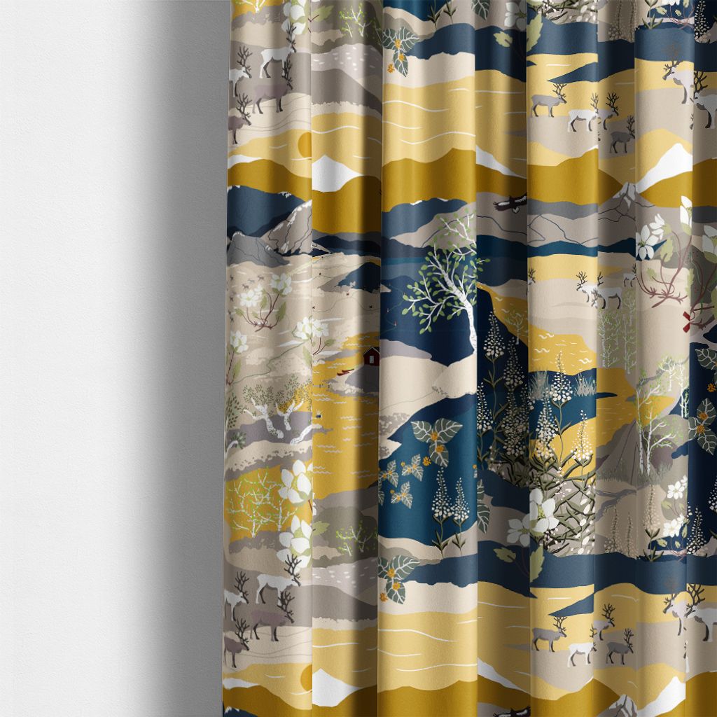 Fjällvandring gul-blå gardiner är perfekta för dig som vill bjuda in känslan av den storslagna nordiska fjällvärlden i ditt hem. Med ett rikt mönster av bergslandskap, renar, örnar och blomstrande växter skapas en levande och detaljerad bild av naturens harmoni. Gardinerna har en harmonisk färgkombination av dämpade gula och blå toner som ger ett balanserat och modernt uttryck.
