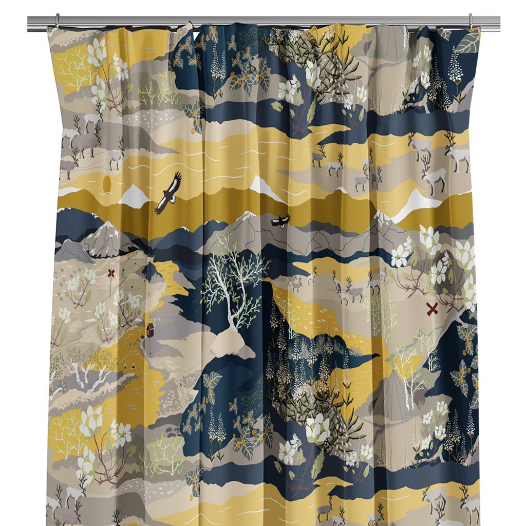 Skapa en känsla av äventyr och natur i ditt hem med våra Fjällvandring gul-blå gardiner. Mönstret fångar den nordiska fjällvärldens skönhet med berg, renar och vilda blommor i naturnära färger.