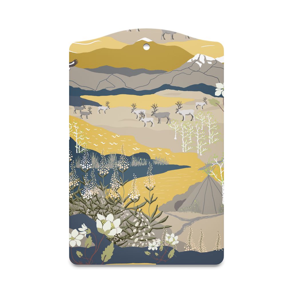 Fjällvandring är en stilren serveringsbräda med ett vackert fjällmotiv inspirerat av den svenska fjällvärlden. De naturnära gula och blå tonerna ger en harmonisk och lugn känsla, vilket gör brädan både praktisk och dekorativ i köket. Perfekt att använda vid servering av ost, chark eller andra delikatesser.