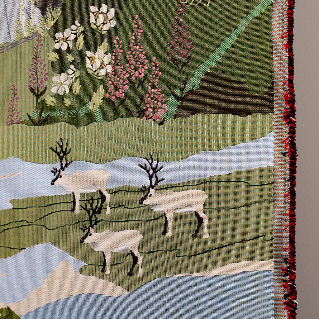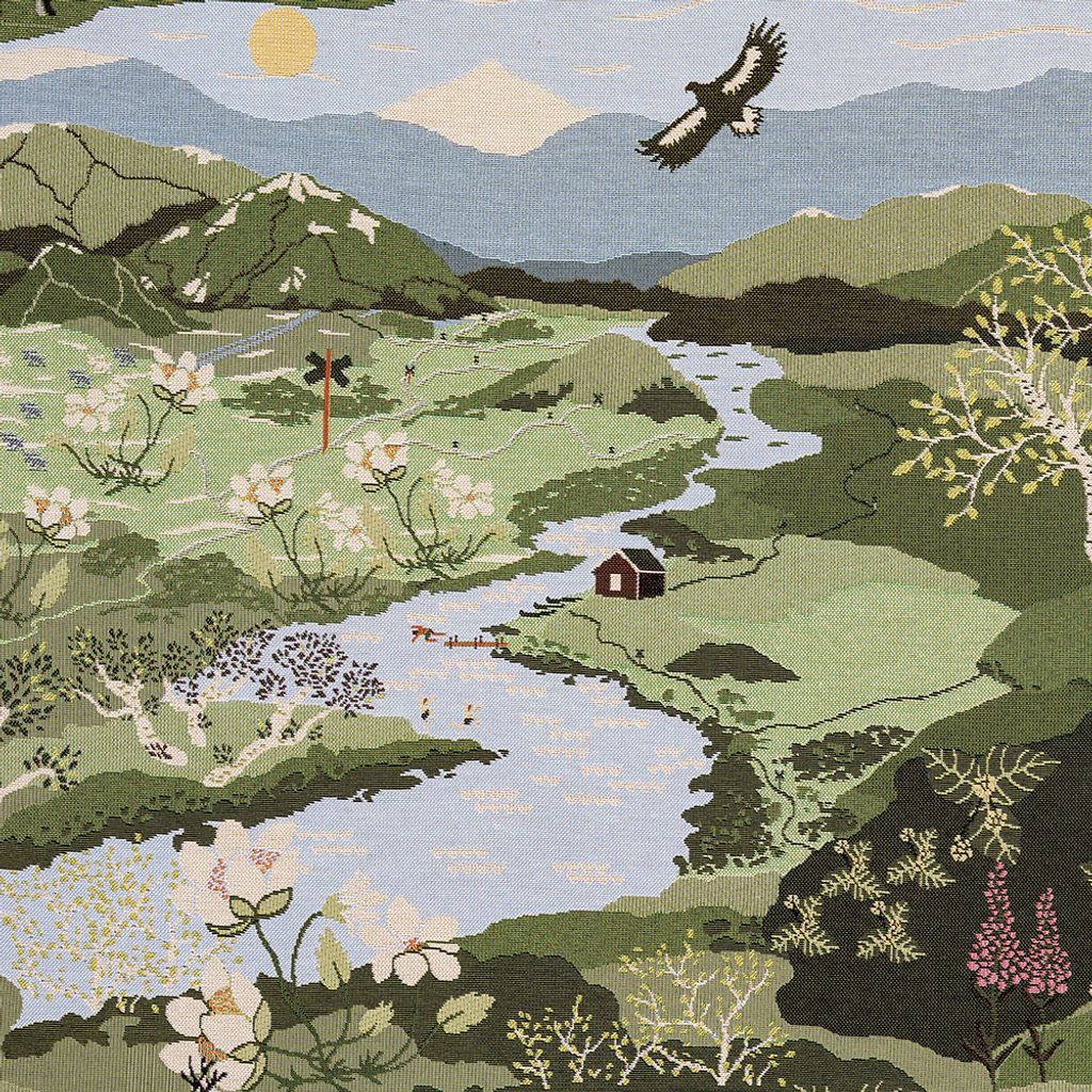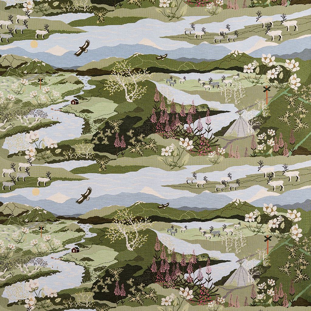 Fjällvandring ljusgrön gobeläng är ett exklusivt gobelängtyg med ett detaljrikt motiv inspirerat av den svenska fjällvärlden. Här möts slingrande vattendrag, gröna dalar, blommande ängar och små renar i ett harmoniskt mönster som ger ett lugnt och levande uttryck.