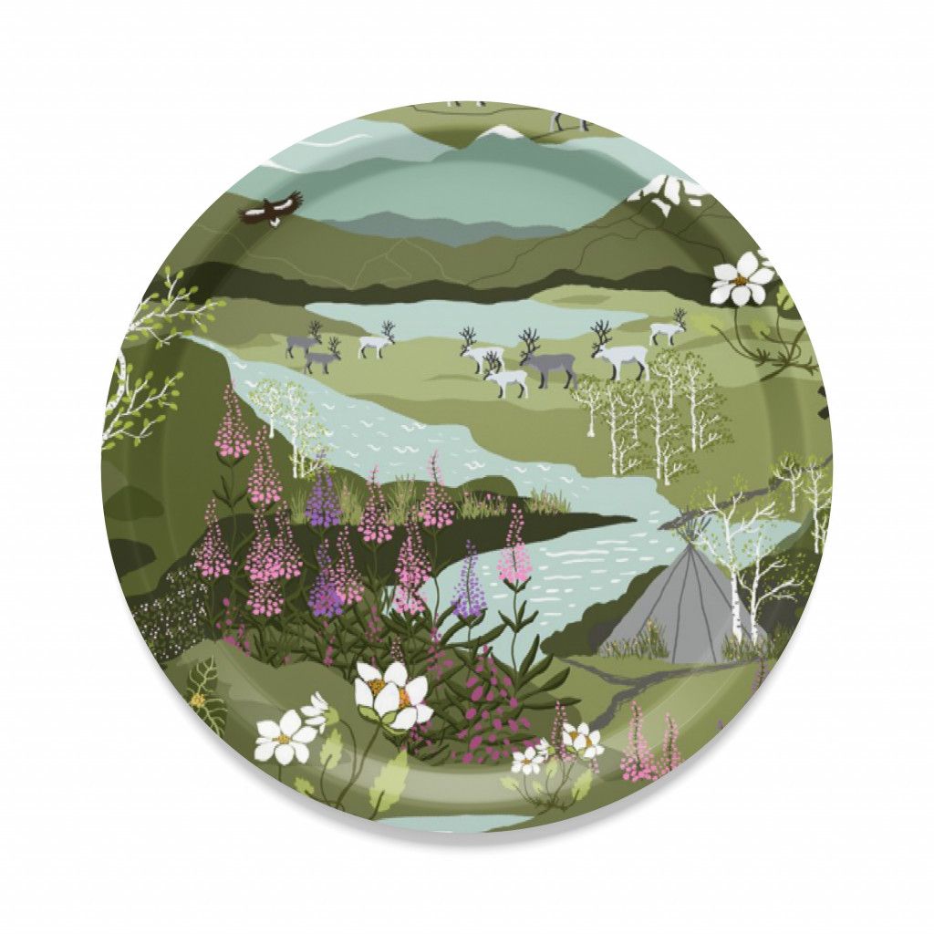 Rund bricka i trälaminat med natur motivet Fjällvandring från Arvidssons textil.