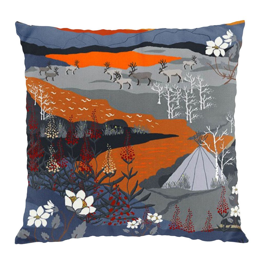 Ett kuddfodral i tyget fjällvandring orange från Arvidssons textil.