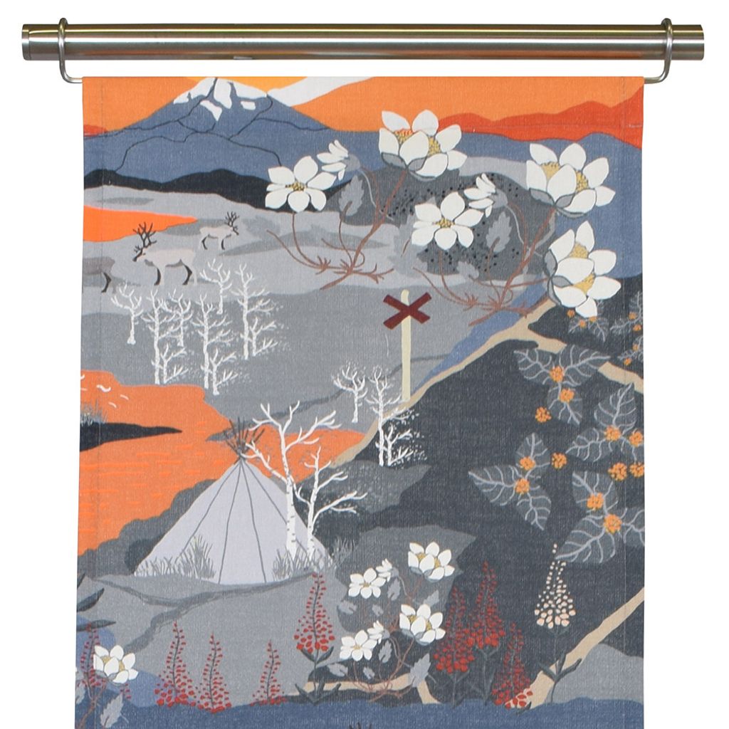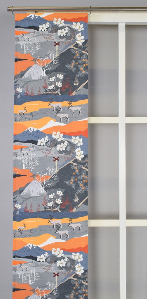 Fjällvandring orange panelgardin är en hyllning till den nordiska fjällvärldens stilla skönhet och färgrika landskap. Mönstret är rikt på detaljer och för tankarna till fjällvandringar under hösten, där vita fjällblommor, renar, tält och knotiga träd ramas in av dramatiska bergsformationer i blått, grått och bränt orange. Denna panelgardin blir ett konstnärligt inslag i hemmet, och passar särskilt bra i naturinspirerade eller rustika interiörer.