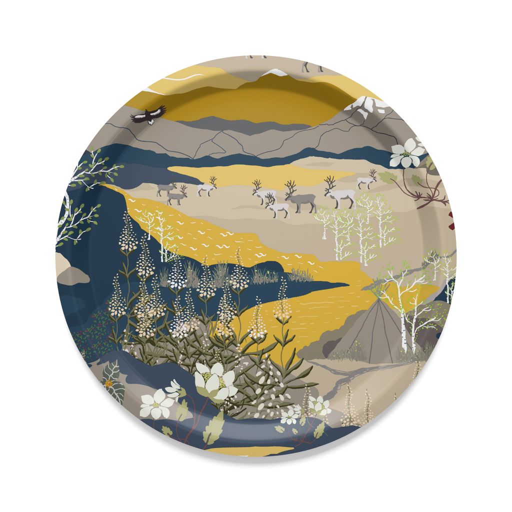Rund bricka 31cm med vackert fjällmotiv i gult och blått. Tillverkad i Sverige av hållbart material – perfekt för servering och dekoration.