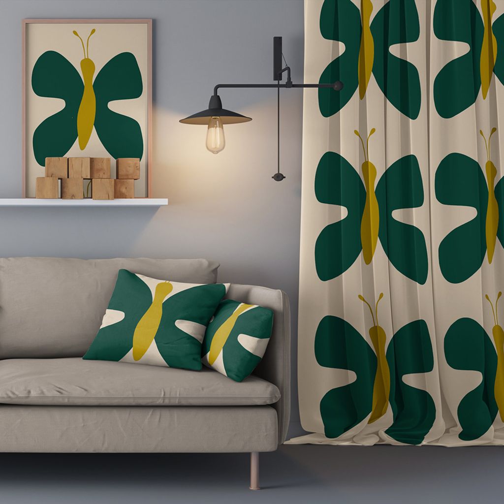Stormönstrat gardin och inredningstyg med stora fjärilar i grönt och gult.