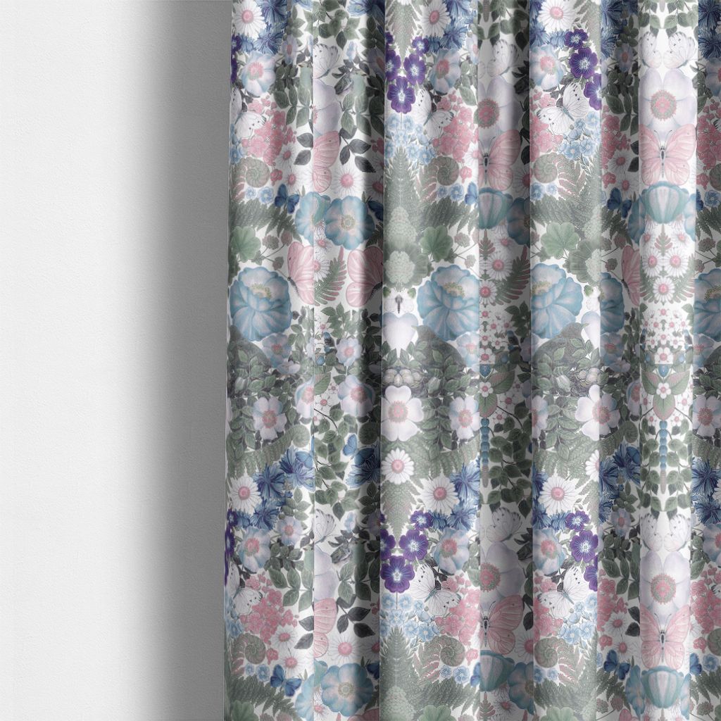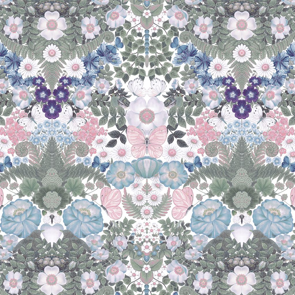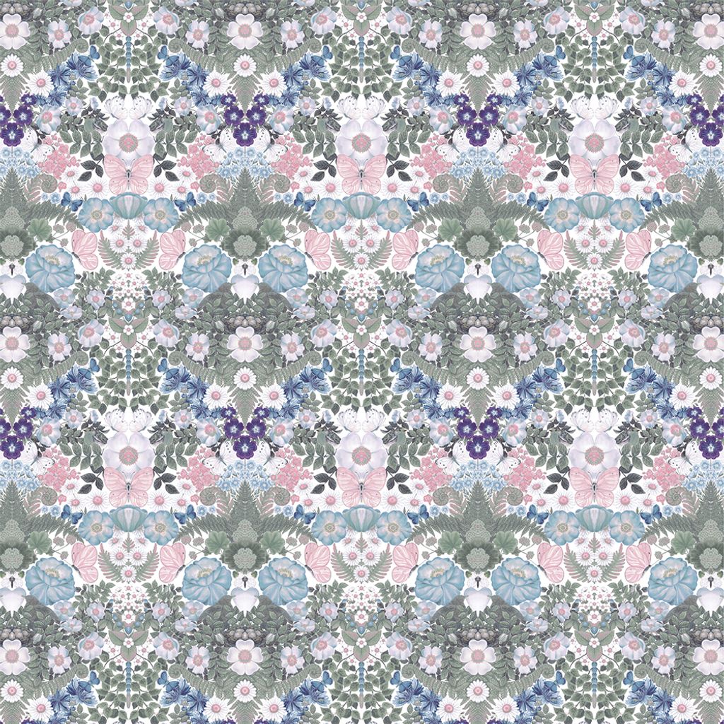 Underbart tryck med blommor, blad, fåglar och fjärilar. Mönster går ihop lite som ett kalejdoskop. Tyg i vackra färger som passar perfekt till gardiner, kuddar, dukar m.m