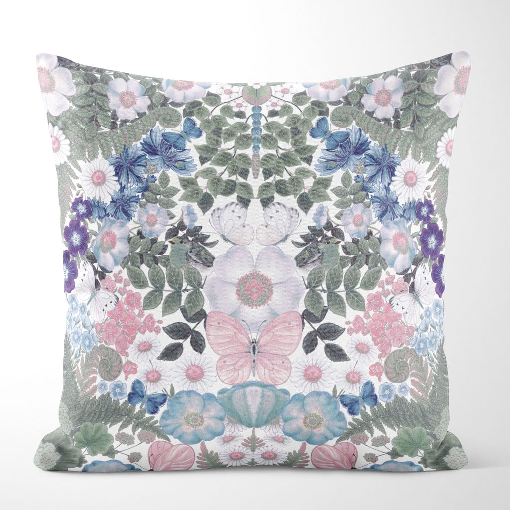 Ett vackert kuddfodral med ett detaljrikt mönster av fjärilar och blommor i turkos och rosa toner. Varje kuddfodral är unikt eftersom 3 fodral klipps från tygets bredd.