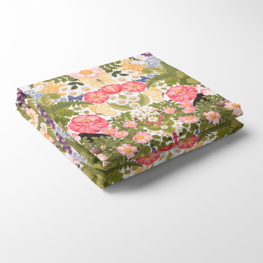 Storblommig bordsduk i tyget Fjärilsblom. Underbart tryck med blommor, blad, fåglar och fjärilar. Mönster går ihop lite som ett kalejdoskop.