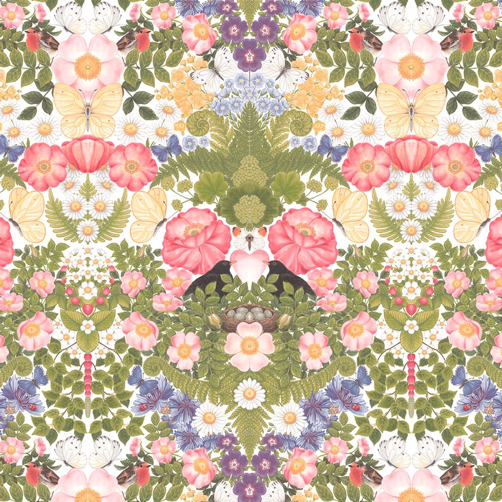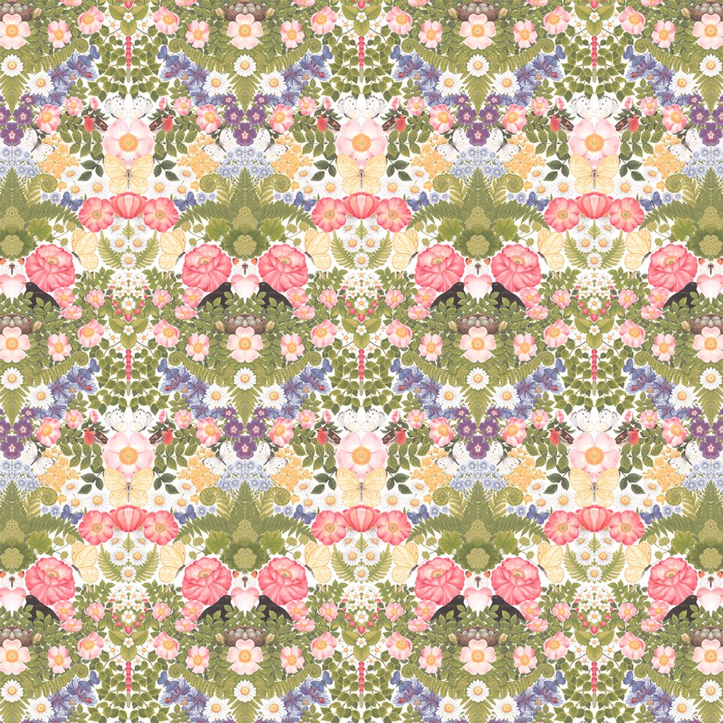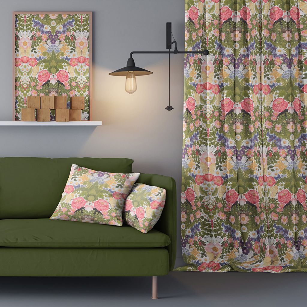 Underbart tryck med blommor, blad, fåglar och fjärilar. Mönster går ihop lite som ett kalejdoskop. Tyg i vackra färger som passar perfekt till gardiner, kuddar, dukar m.m