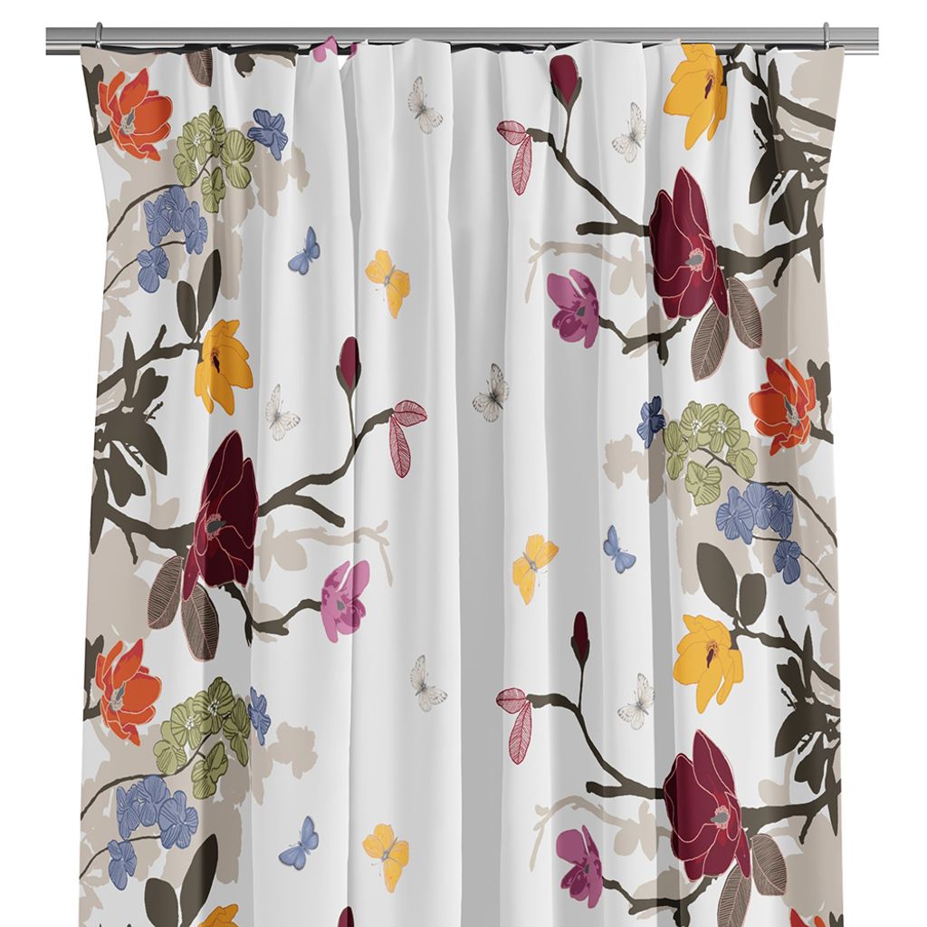 Fjärilsträdgården multi gardiner har eleganta blomgrenar i nyanser av rött, gult, orange, blått och grönt, samt charmiga fjärilar som ger en känsla av rörelse och liv.