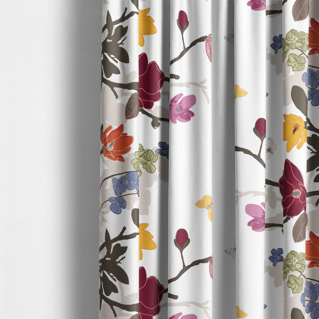 Fjärilsträdgården multi tyg bjuder på en explosion av färg och liv. Mönstret är noggrant utformat för att rama in tyget från sidorna mot mitten, med blommor i röda, gula, gröna, blå och lila nyanser. Fjärilarna och grenarnas detaljer förstärker designens naturliga tema, vilket gör tyget perfekt för både gardiner och andra hemtextilier som behöver en färgstark touch. Detta tyg är ett utmärkt val för dig som vill skapa en varm, inbjudande och personlig känsla i ditt hem, oavsett stil.