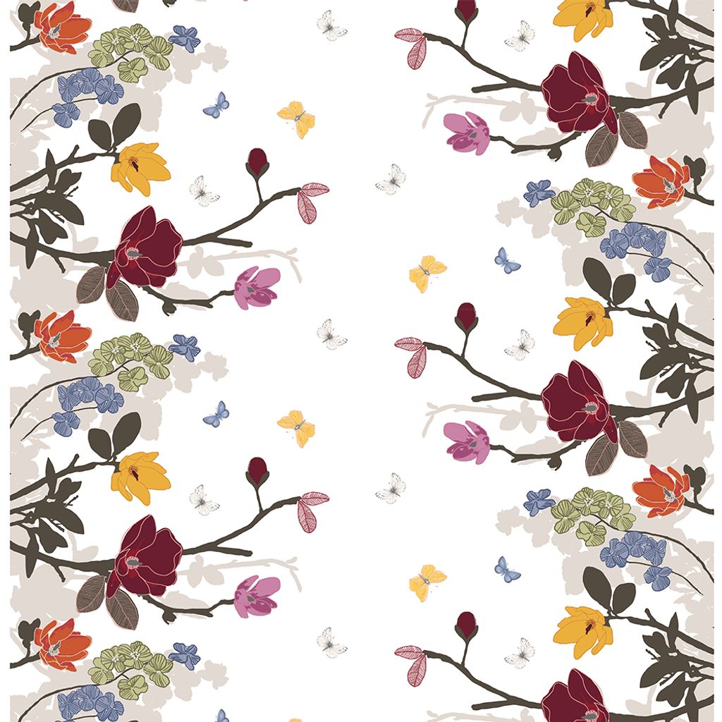 Fjärilsträdgården multi tyg är ett dynamiskt och färgstarkt tyg som fångar naturens liv och rörelse. Med ett mönster där blommor i röda, gula, gröna, blå och lila toner sträcker sig från sidorna mot mitten, skapas en naturlig inramning som kompletteras av graciösa fjärilar och subtila grenar. Ett perfekt val för att ge gardiner och hemtextilier en varm, levande och unik känsla.