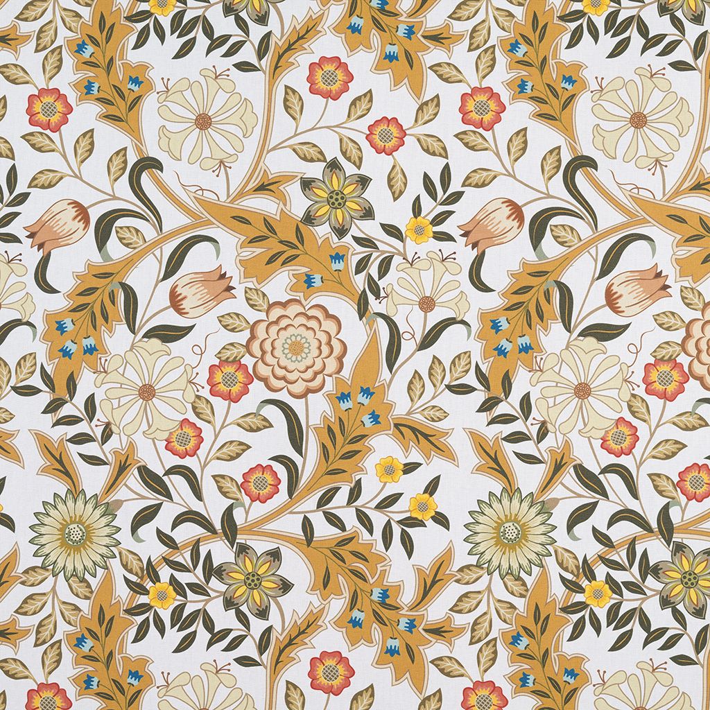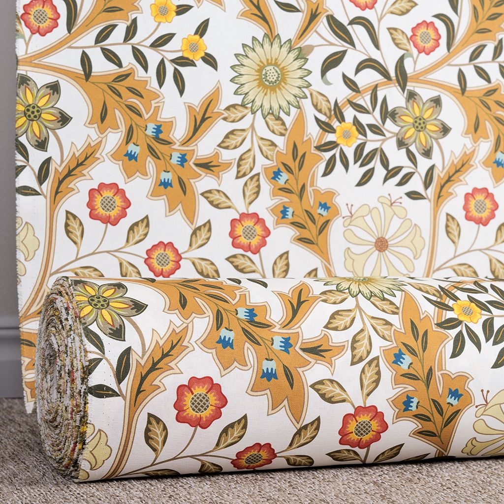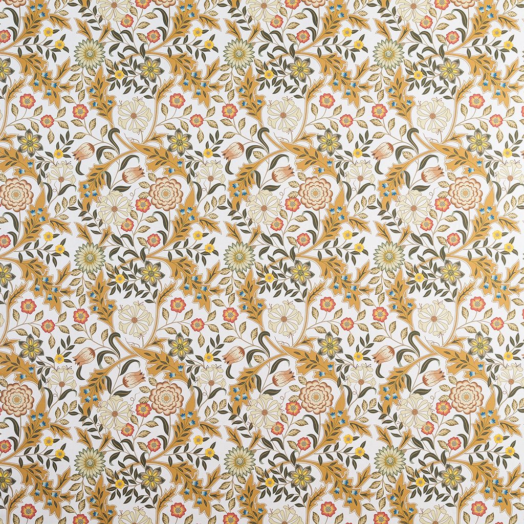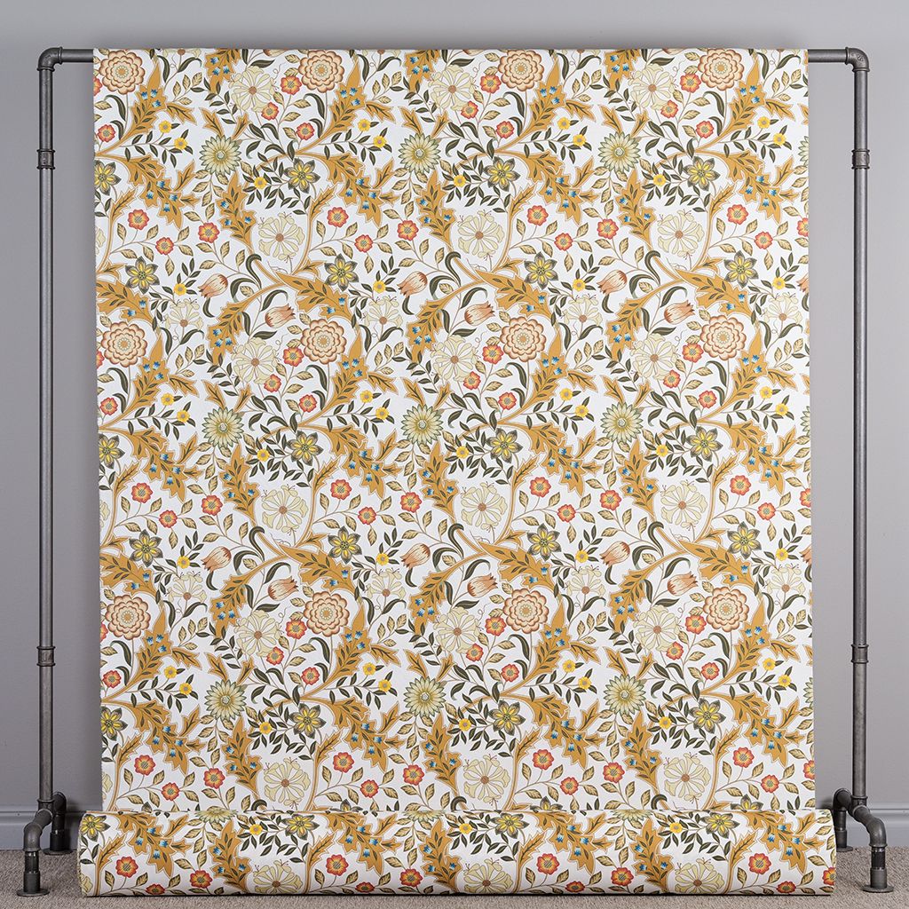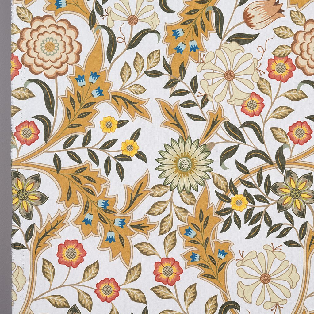 Den ljusa bakgrunden gör att tyget känns fräscht och lätt, medan de varma färgerna tillför djup och karaktär. Flora ockra passar perfekt för dig som vill skapa en inbjudande och ombonad atmosfär – oavsett om det används till gardiner, kuddar eller andra textila inredningsdetaljer.