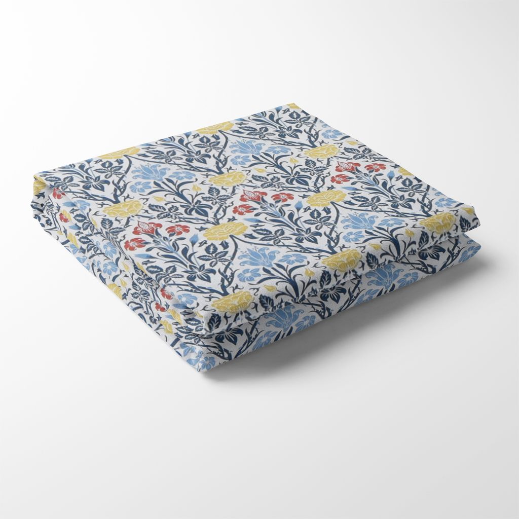 Stor bordsduk med vackra blommor i gult och rostrött, snyggt bladmönster i blått likt en Morris tapet.