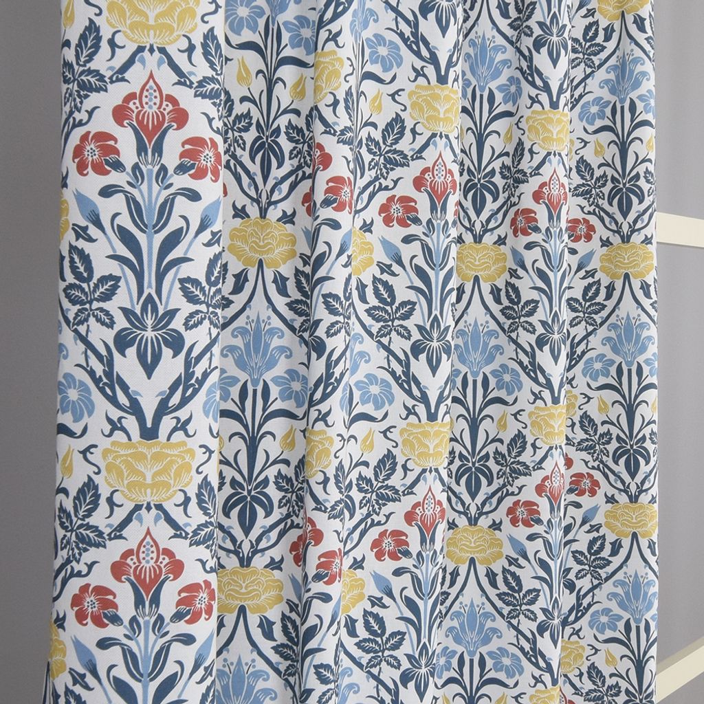 Gardiner med vit botten, vackra blommor i gult och rost rött, snyggt bladmönster i blått.