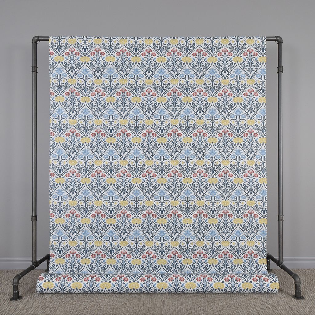 Florentina vit-blå tygpå metervara för gardiner och inredning med mönster likt en tapet i blått, gult och rost rött.
