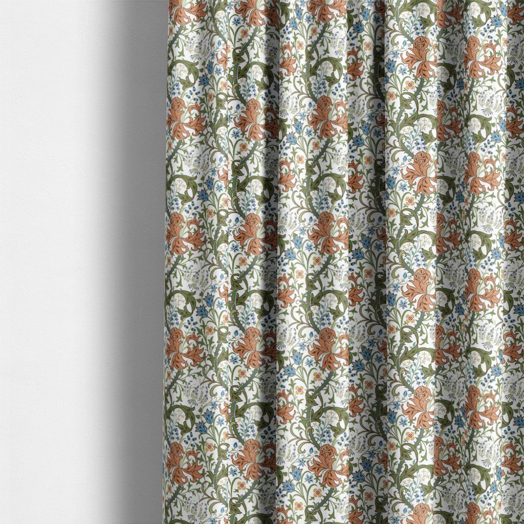 Floriana grön-rost är ett tidlöst tyg som för tankarna till arts & crafts-erans hantverk och dekorativa blomsterformer. Mönstret slingrar sig över tyget i en harmonisk rörelse där grönskande rankor möter rostfärgade blommor och himmelsblå knoppar. Basen i mönstret är lugn och balanserad, vilket gör att den passar i såväl klassiska hem som moderna miljöer med naturen i fokus.