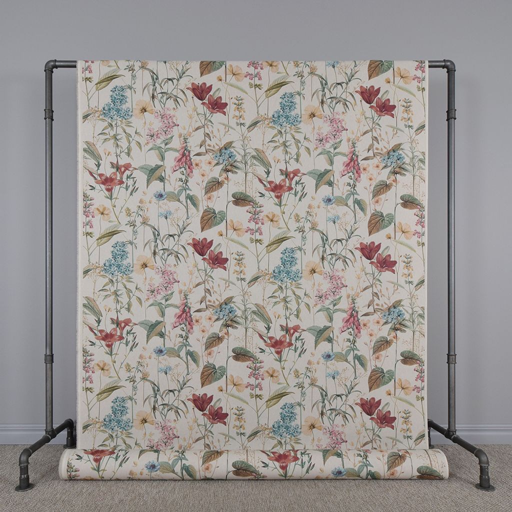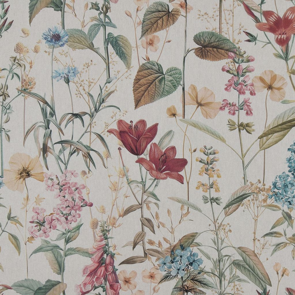 Ett romantiskt och naturinspirerat tyg med ett detaljerat mönster av ängsblommor och bladverk. Perfekt för gardiner, dukar, kuddar och andra textila inredningsprojekt.