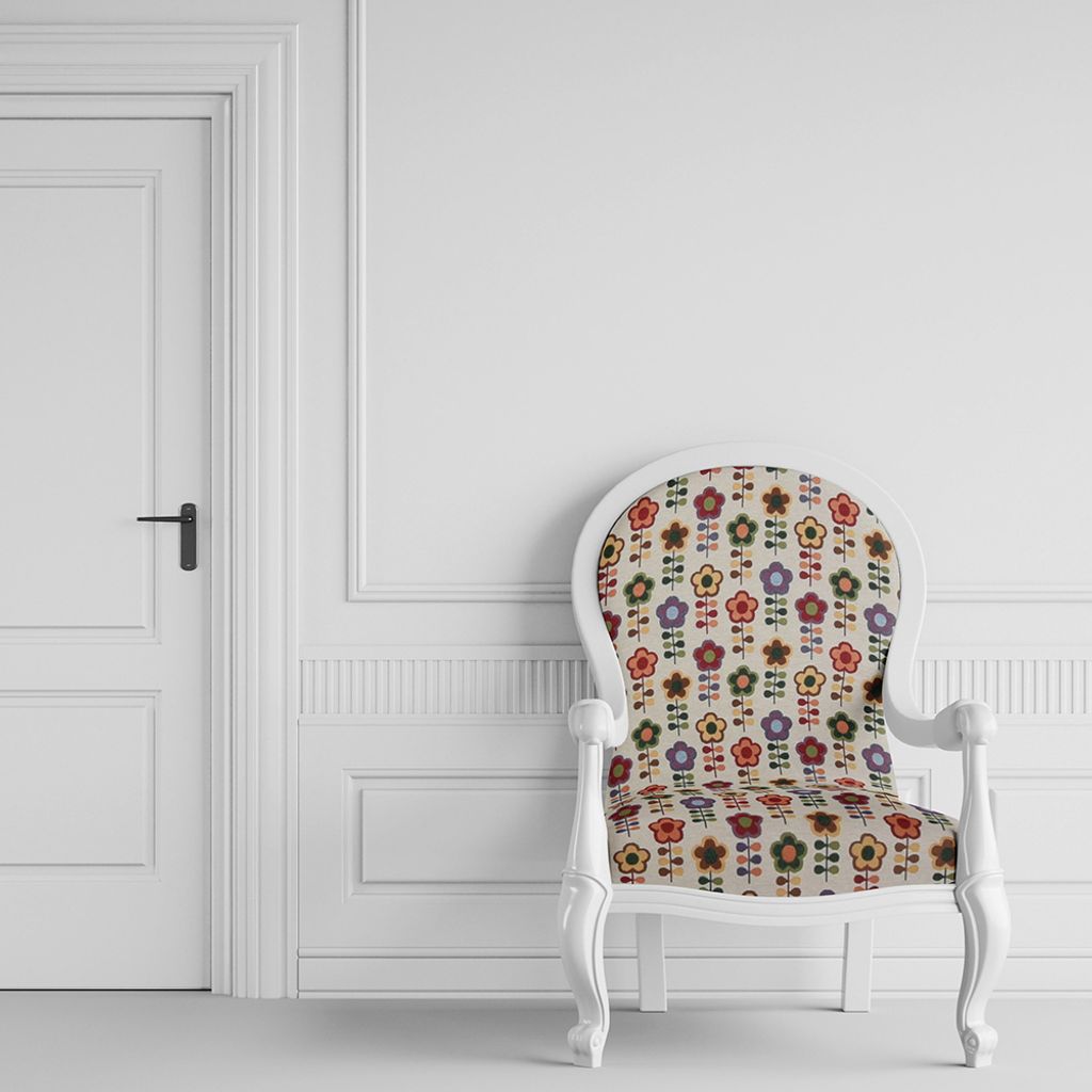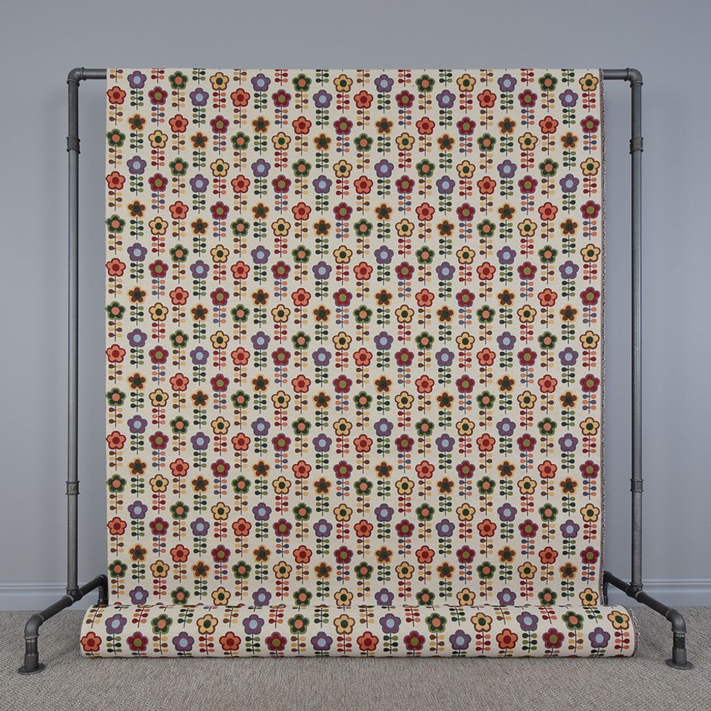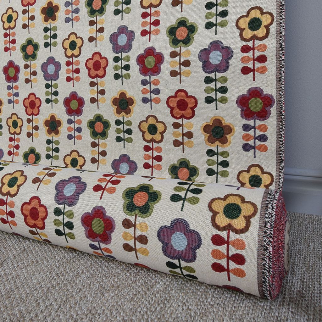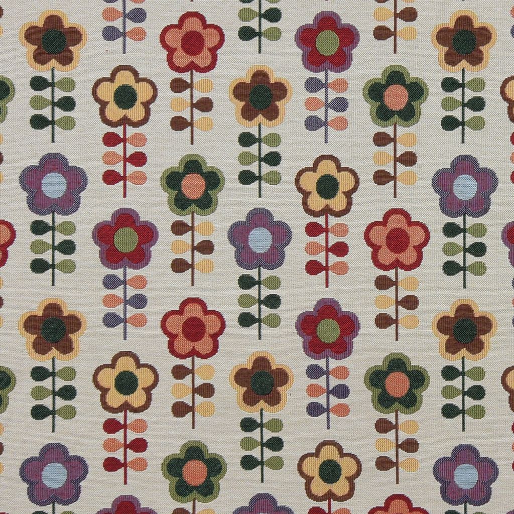 Beige botten med färgglada retro blommor, gobeläng tyg på metervara.