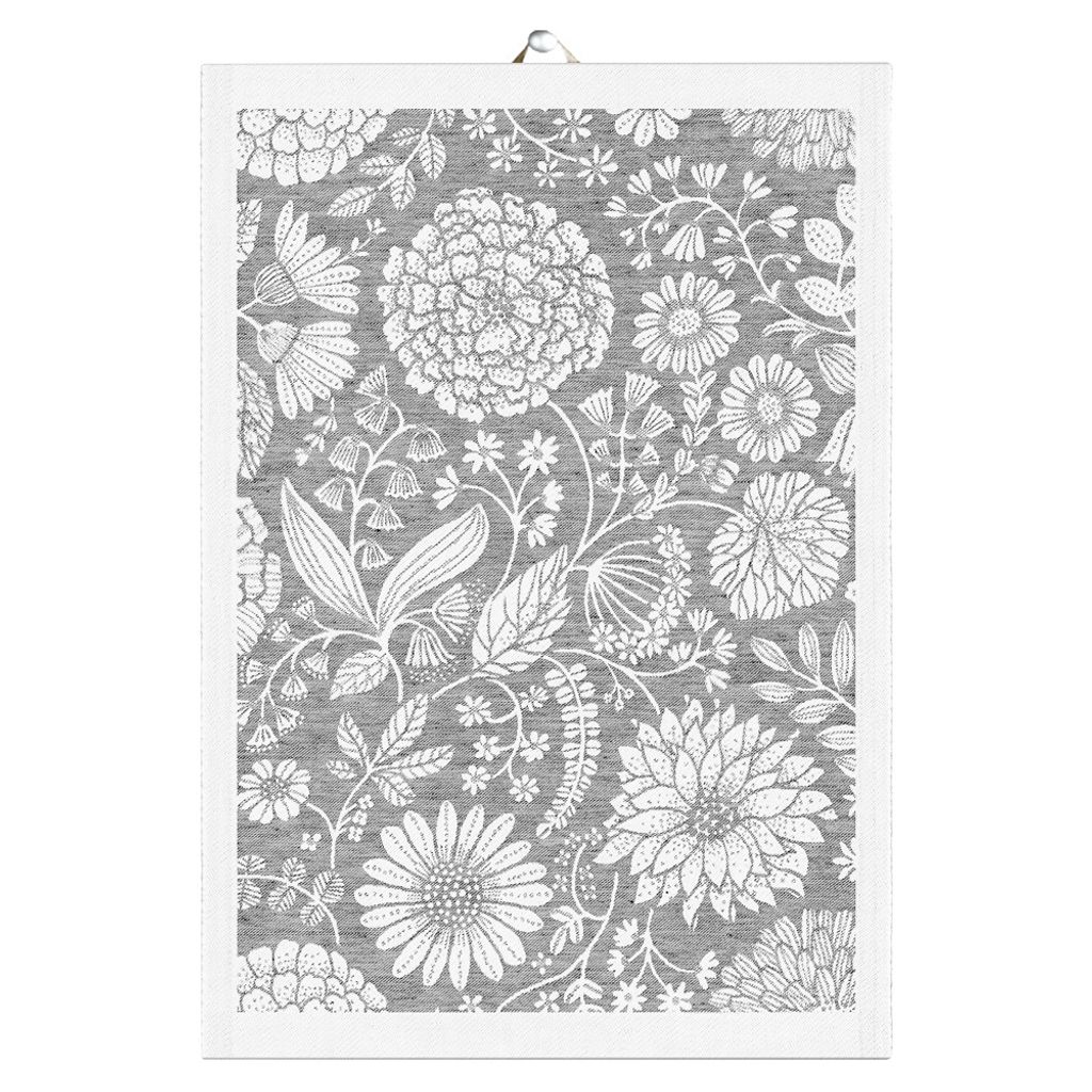 Stilrena handduk i ekologiskt material. Grått blommönstret tillför en sofistikerad touch till ditt kök. GOTS-certifiering och tillverkade i Sverige