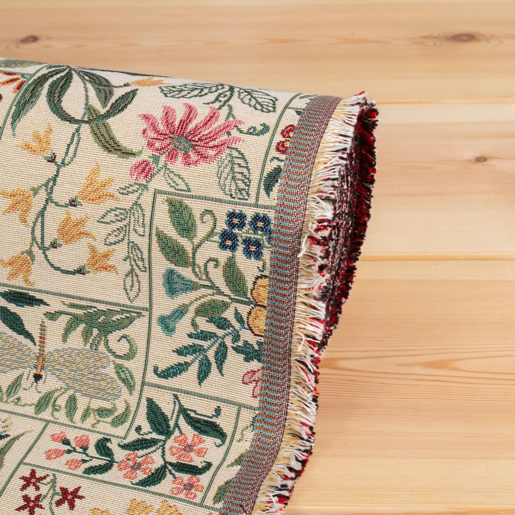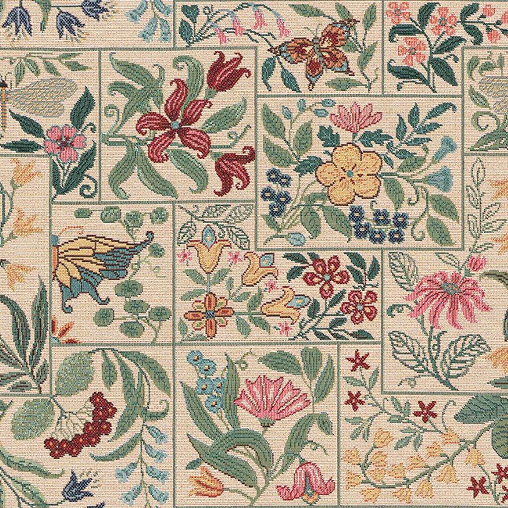 Fint gobeläng tyg på metervara med beige botten, färgglad blommor och rutor.