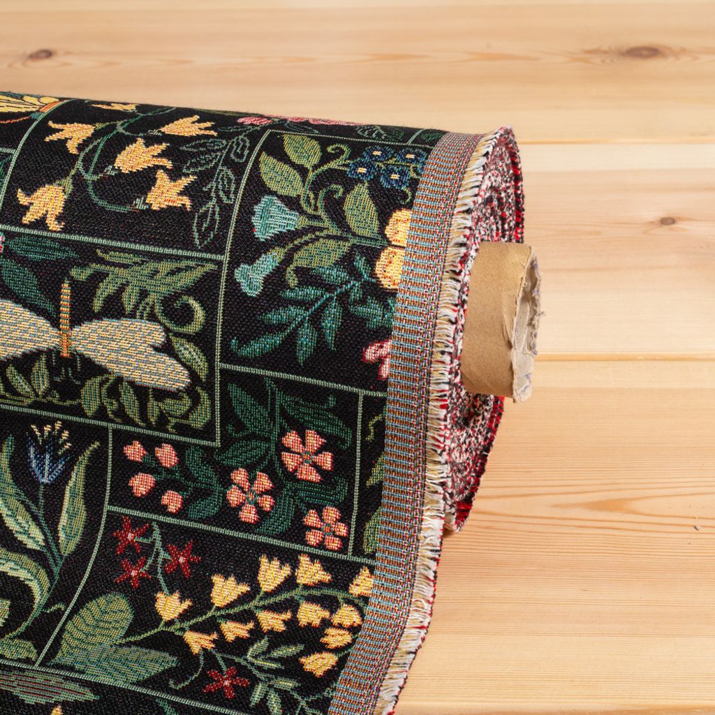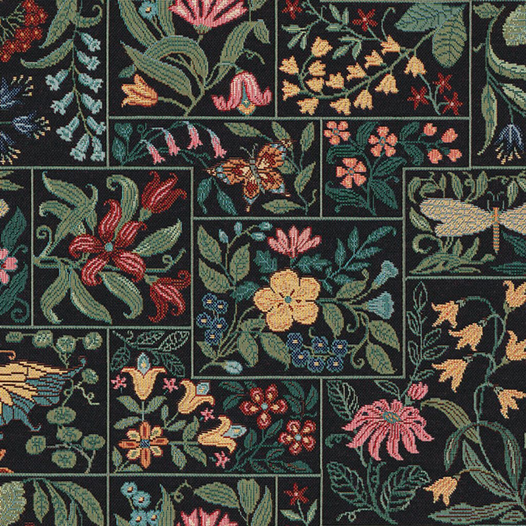 Fint gobeläng tyg på metervara med svart botten, färgglad blommor och rutor.