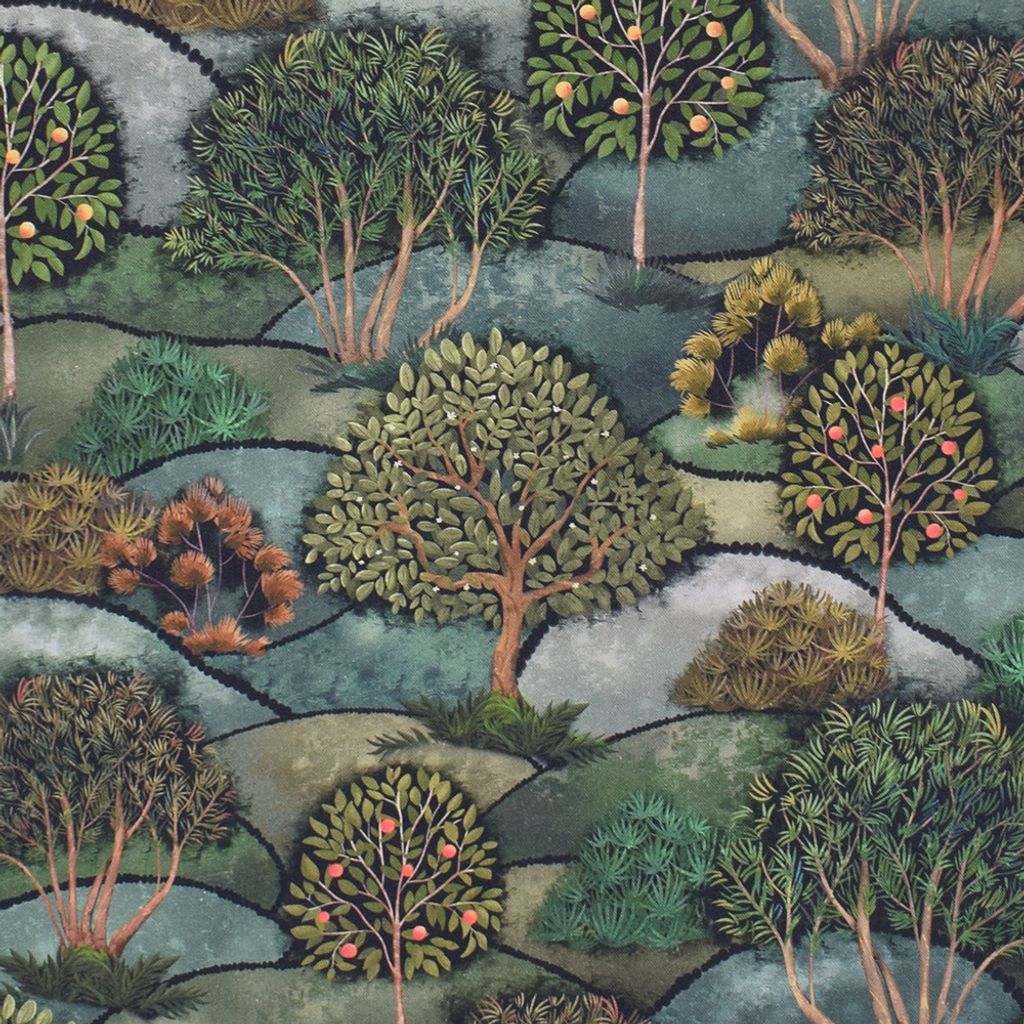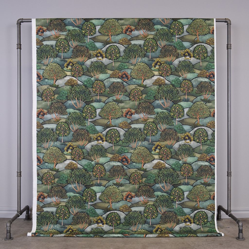 Tyg på metervara för gardiner och inredning med kullar och vackra träd