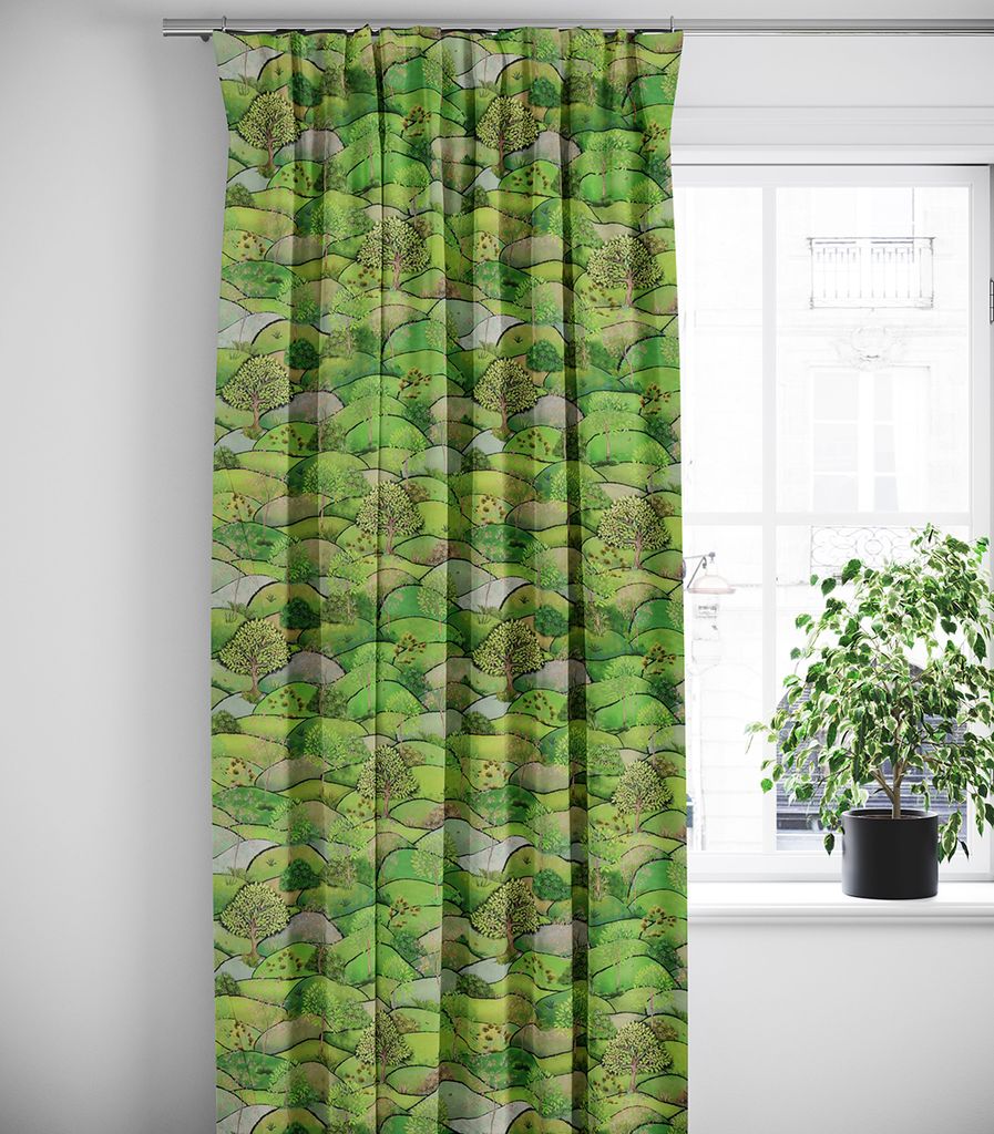 Gröna gardiner med landskap med kullar och träd i vårskrud