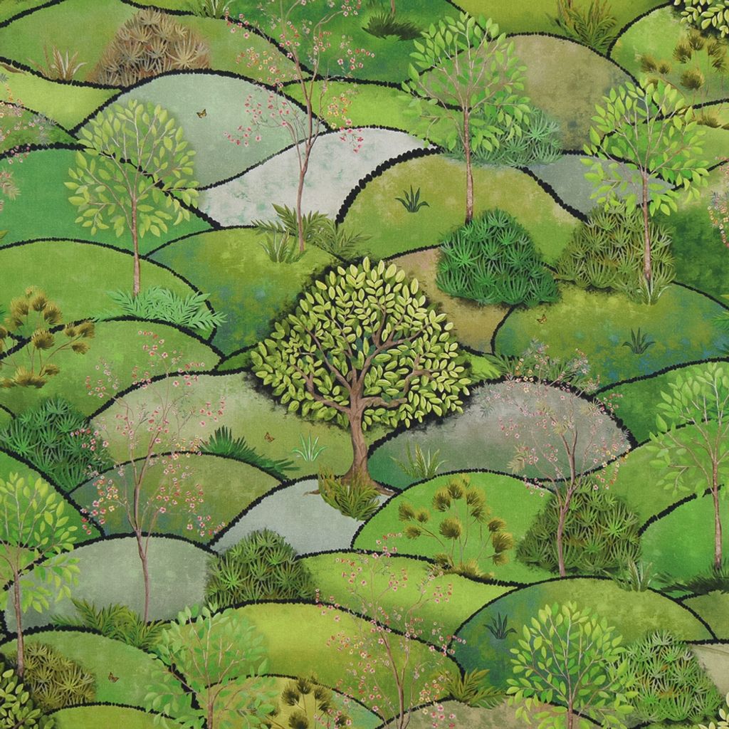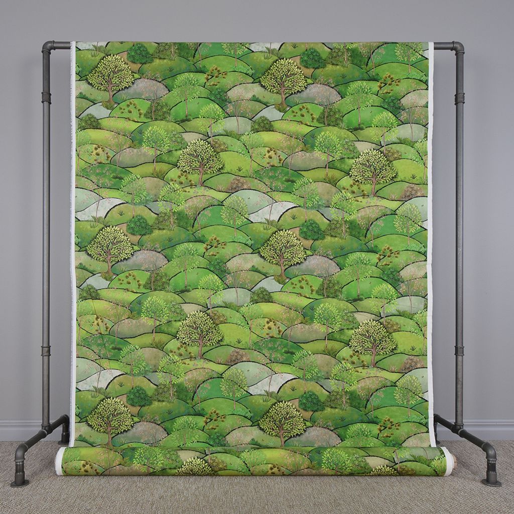Tyg på metervara för gardiner och inredning med kullar och vackra träd