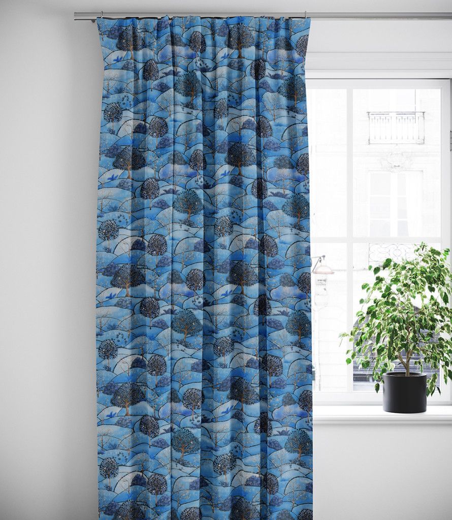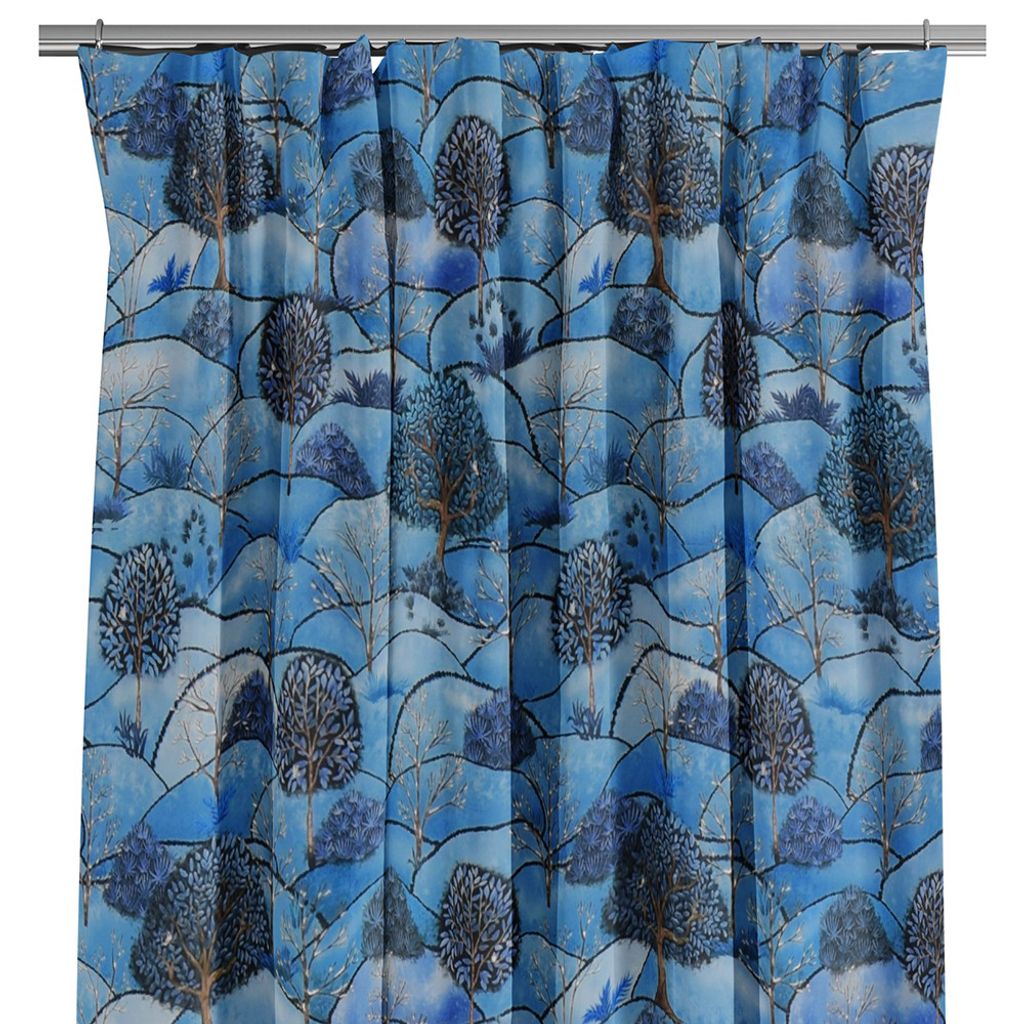Blå gardiner med mönster av landskap med kullar och träd i vinterskrud.